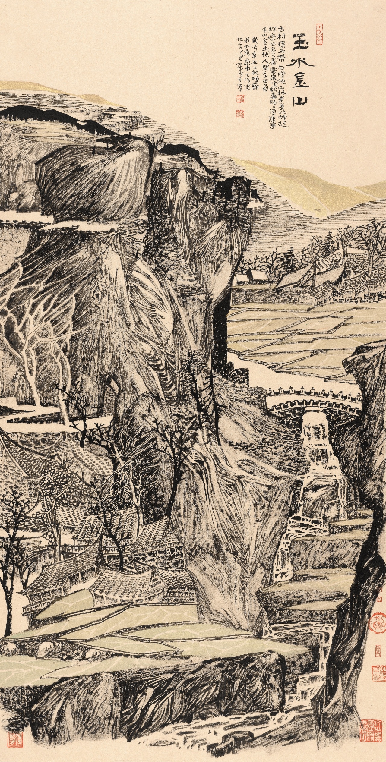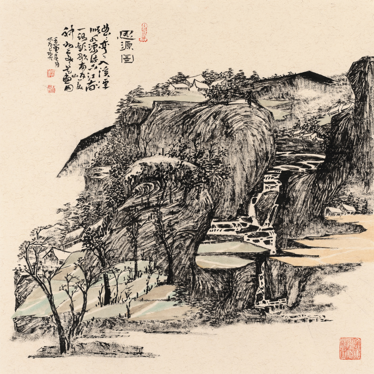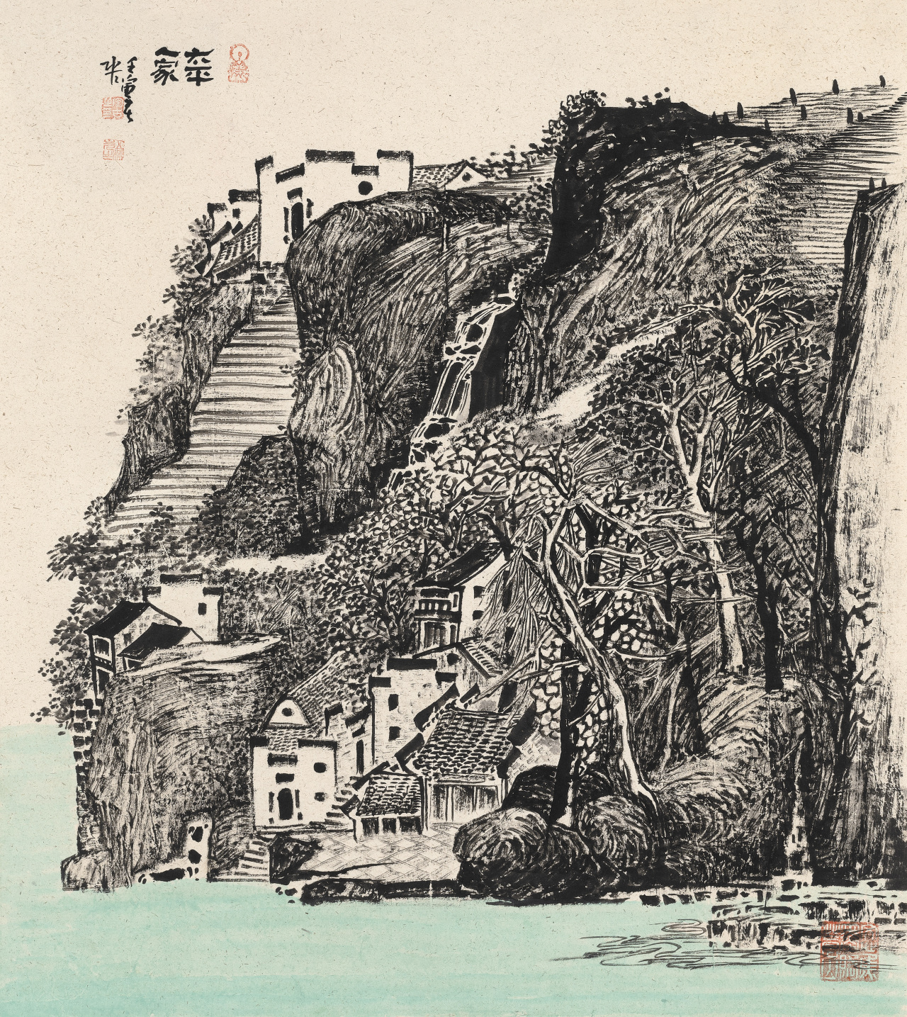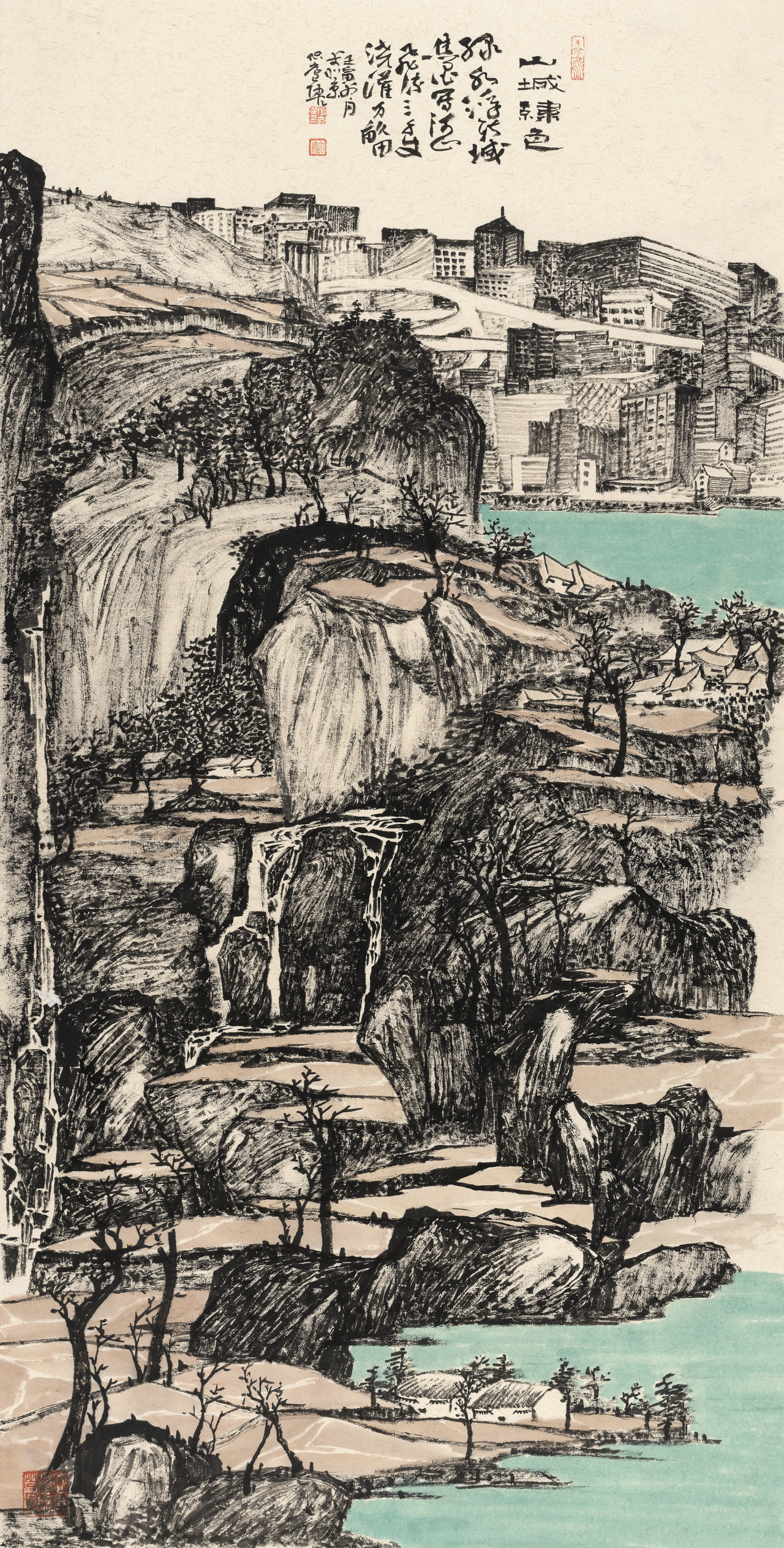 陶古的山水有人烟的,有村落的,从村落过渡到城镇,从城镇到城市,就到了钱学森提的“山水城市”这个概念,陶古在题材上填补了一般山水画家不敢碰的城镇与城市。1992年8月14日,大科学家钱学森给我写信说,笔墨当随时代,城市都那么热闹了,笔墨能不能画城市?