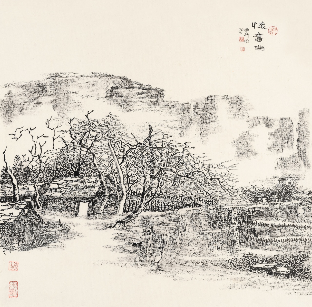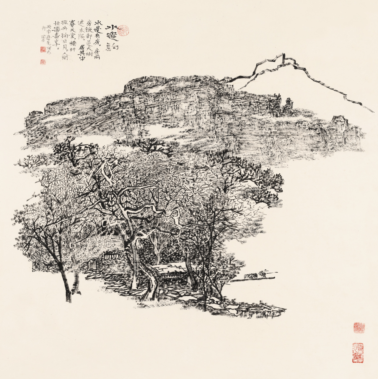 陶古以焦墨为主,适当的变化,偶尔也带一点颜色,但陶古比较注意构成,有时候,突然有一块白,断云也好,土坡也好,他从画面构成上、视觉上,对焦墨进行拓展、深化,给予展望。所以,焦墨要充分发挥它的局限性,它安身立命的特色就是它的局限性,要发挥它真正的特点。