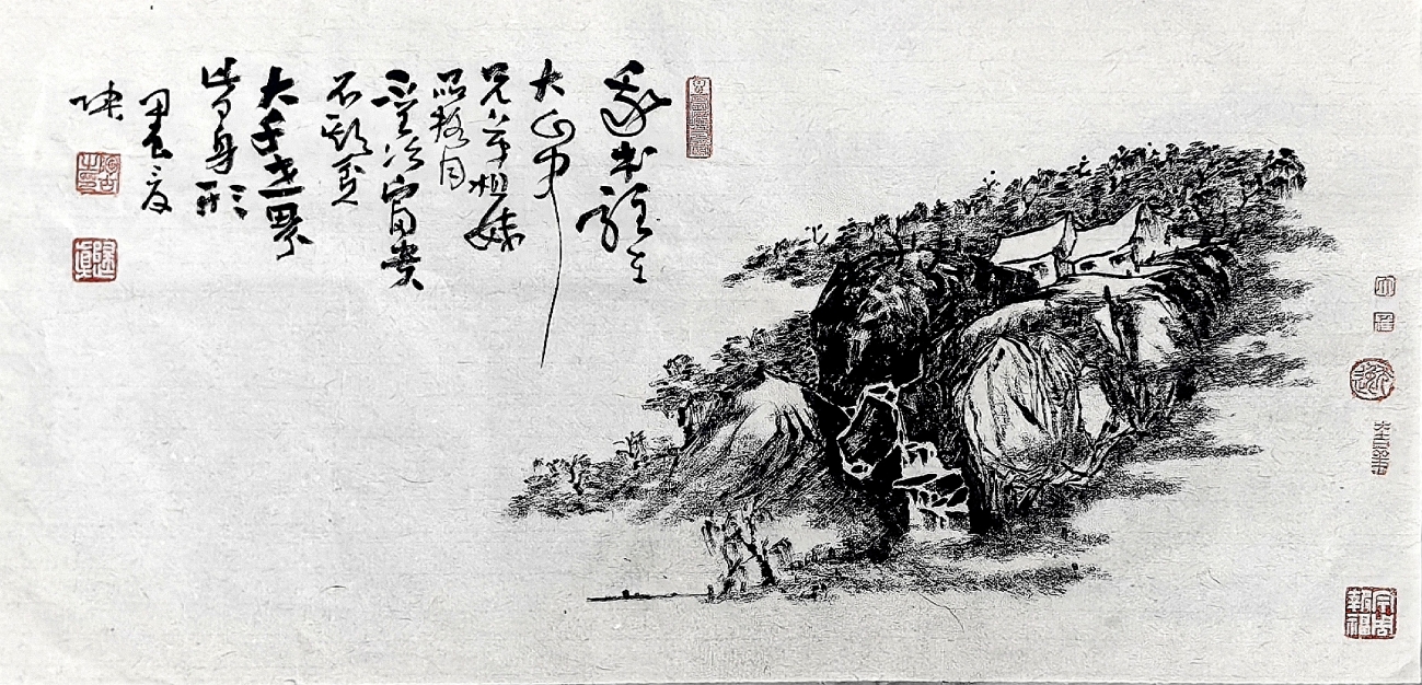 诗书画印是中国传统书画四大法宝,衡量一个书画家的艺术内核高低离不开这四个元素,无论技法,画理,美学等方面,陶古先生都是有高度的,在他的焦墨山水作品里,你还能品味到文学性,诗性,陶古先生的诗词都是自己创作的古体诗,很多诗句耐人寻味,既有打油诗的生活气,又有高拔洒脱的文人气,诗有诗眼,画有画眼,题画诗不仅诠释了绘画的内涵,也起到画龙点睛的作用,让作品顿时生龙活虎,不得不说,陶古是一个素养比较全面,有一颗文心的艺术家。